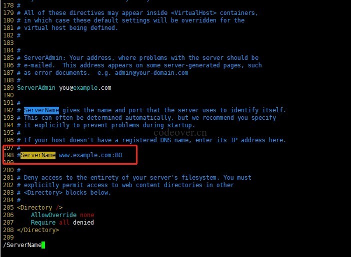 进入 apache 配置目录 cd /usr/local/httpd/etc/,编辑 httpd.conf,解除 200 行左右的 ServerName 的注释