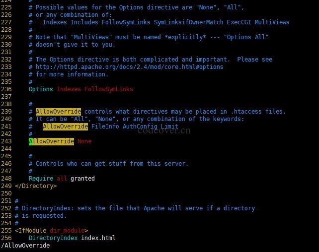 多站点配置 将 httpd.conf 第 243 行左右的 AllowOverride None 修改为 AllowOverride All