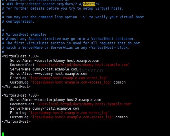 <VirtualHost *:80 > ServerAdmin webmaster@dummy-host.example.com DocumentRoot "/usr/local/httpd/docs/dummy-host.example.com" ServerName dummy-host.example.com ServerAlias www.dummy-host.example.com ErrorLog "logs/dummy-host.example.com-error_log" CustomLog "logs/dummy-host.example.com-access_log" common </VirtualHost>