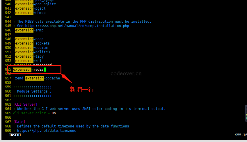 修改 php 安装目录下 etc/php.ini 文件中新增一行 extension=memcached ,如图所示: