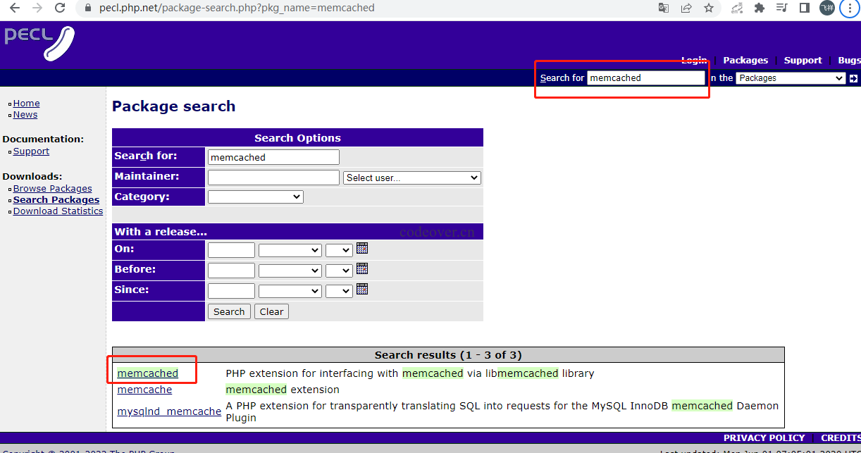 pecl 官网:https://pecl.php.net,在右上角输入 memcached 并搜索并进入,复制相应的下载链接