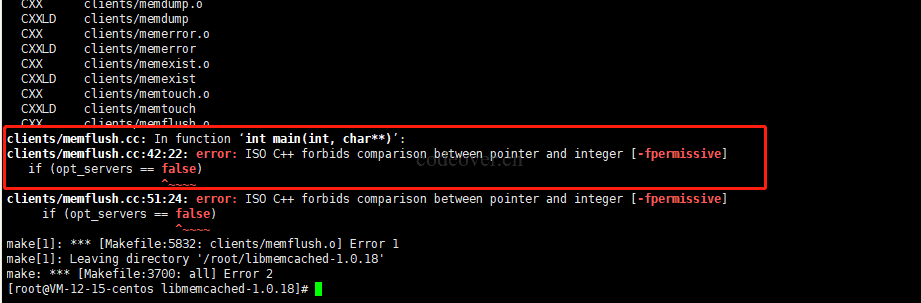 注意:如在执行 make 中遇到 clients/memflush.cc:42:22: error: ISO C++ forbids comparison between pointer and integer [-fpermissive] 的报错,可直接使用 vim 将 clients/memflush.cc 文件的 42 行的 false 修改为 0,然后重新执行 nake && make install 即可成功