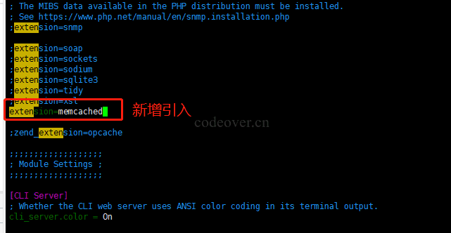 修改 php 安装目录下 etc/php.ini 文件中新增一行 extension=memcached ,如图所示: