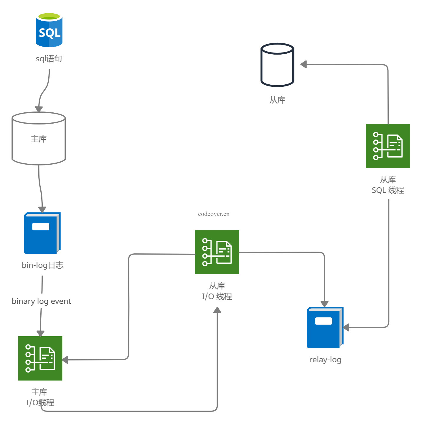 binary log event并发送给从库的 I/O进程 。 - 从库的 I/O线程 获取到主库发送的日志内容(binlog)后,将收到的日志更新到本机的中继日志(relay-log)中,